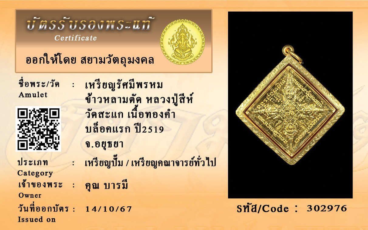 รหัสสินค้า : 302976 เหรียญรัศมีพรหม ข้าวหลามตัด หลวงปู่สีห์ วัดสะแก เนื้อทองคำ บล็อคแรก ปี2519 จ.อยุธยา