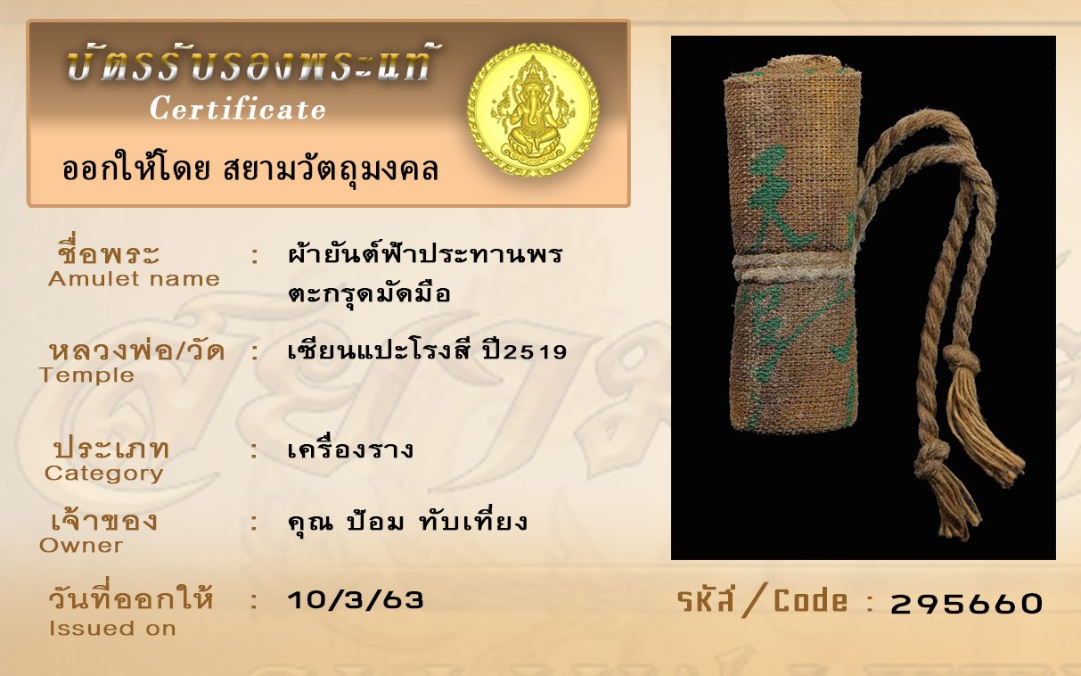 รหัสสินค้า : (295660) ผ้ายันต์ฟ้าประทานพร ตระกรุดมัดมือ เซียนแปะโรงสี ปี2519