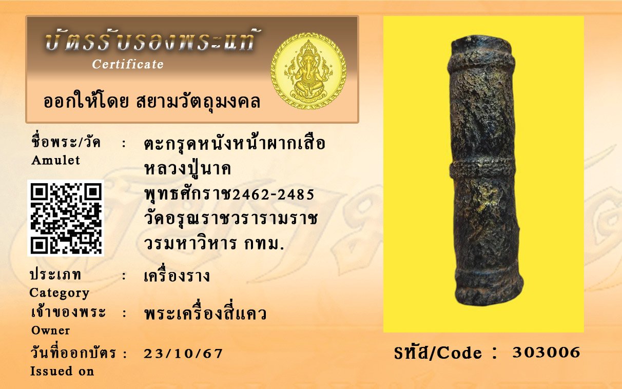 รหัสสินค้า : 303006 ตะกรุดหนังหน้าผากเสือ หลวงปู่นาค พุทธศักราช2462-2485 วัดอรุณราชวรารามราช วรมหาวิหาร กทม.