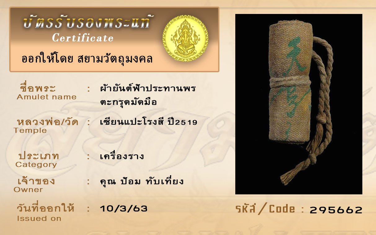 รหัสสินค้า : (295662) ผ้ายันต์ฟ้าประทานพร ตระกรุดมัดมือ เซียนแปะโรงสี ปี2519