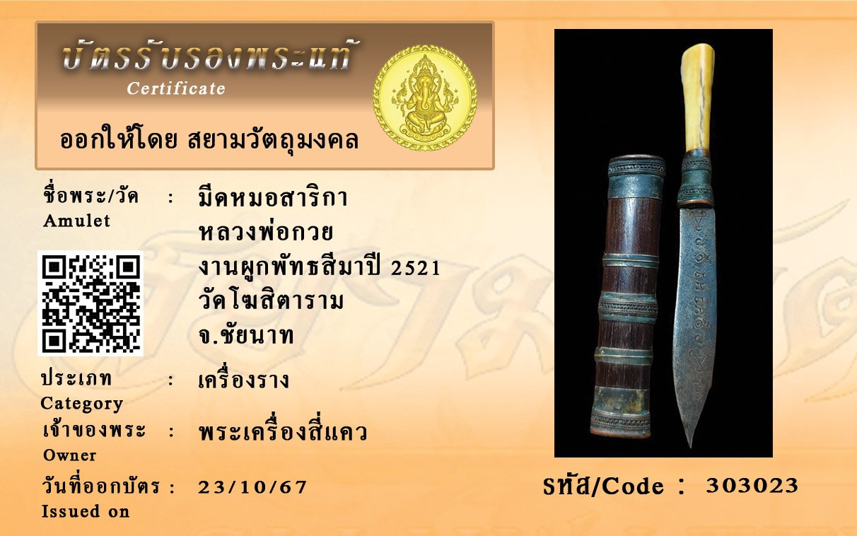 รหัสสินค้า : 303023 มีดหมอสาริกา หลวงพ่อกวย งานผูกพัทธสีมาปี 2521 วัดโฆสิตาราม จ.ชัยนาท