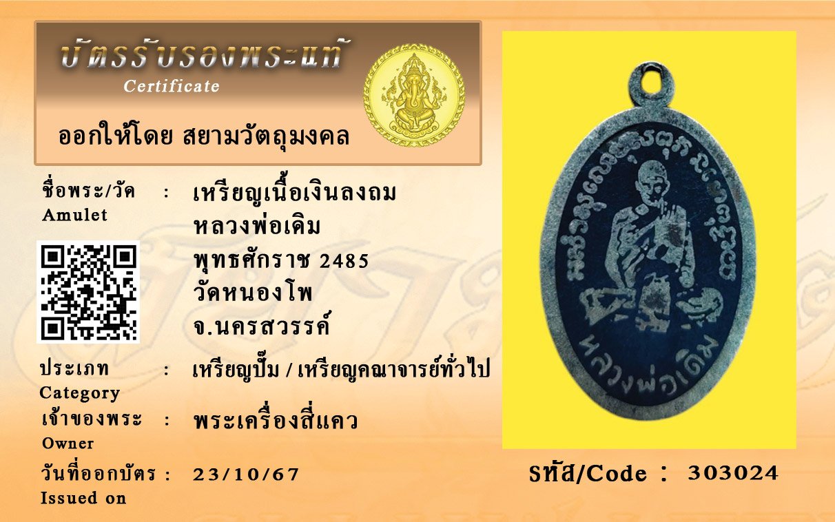 รหัสสินค้า : 303024 เหรียญเนื้อเงินลงถม หลวงพ่อเดิม พุทธศักราช 2485 วัดหนองโพ จ.นครสวรรค์