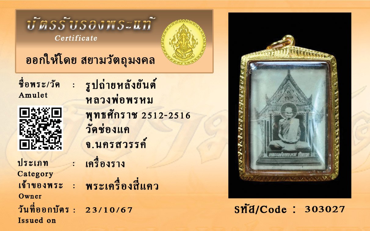 รหัสสินค้า : 303027 รูปถ่ายหลังยันต์ หลวงพ่อพรหม พุทธศักราช 2512-2516 วัดช่องแค จ.นครสวรรค์