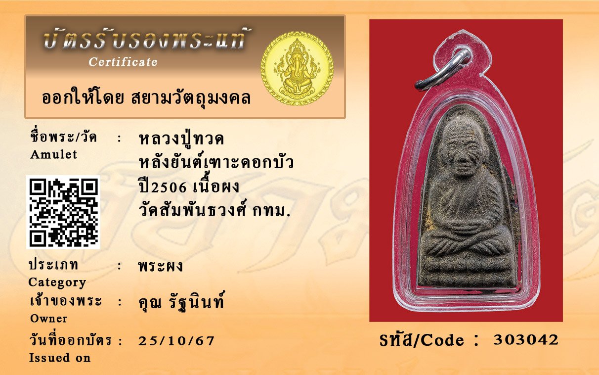 รหัสสินค้า : 303042 หลวงปู่ทวด หลังยันต์เฑาะดอกบัว ปี2506 เนื้อผง วัดสัมพันธวงศ์ กทม.