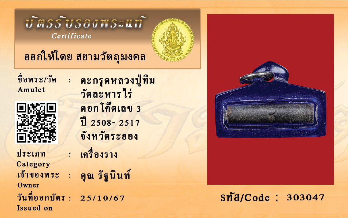 รหัสสินค้า : 303047 ตะกรุดหลวงปู่ทิม วัดละหารไร่ ตอกโค๊ตเลข 3 ปี 2508- 2517 จังหวัดระยอง