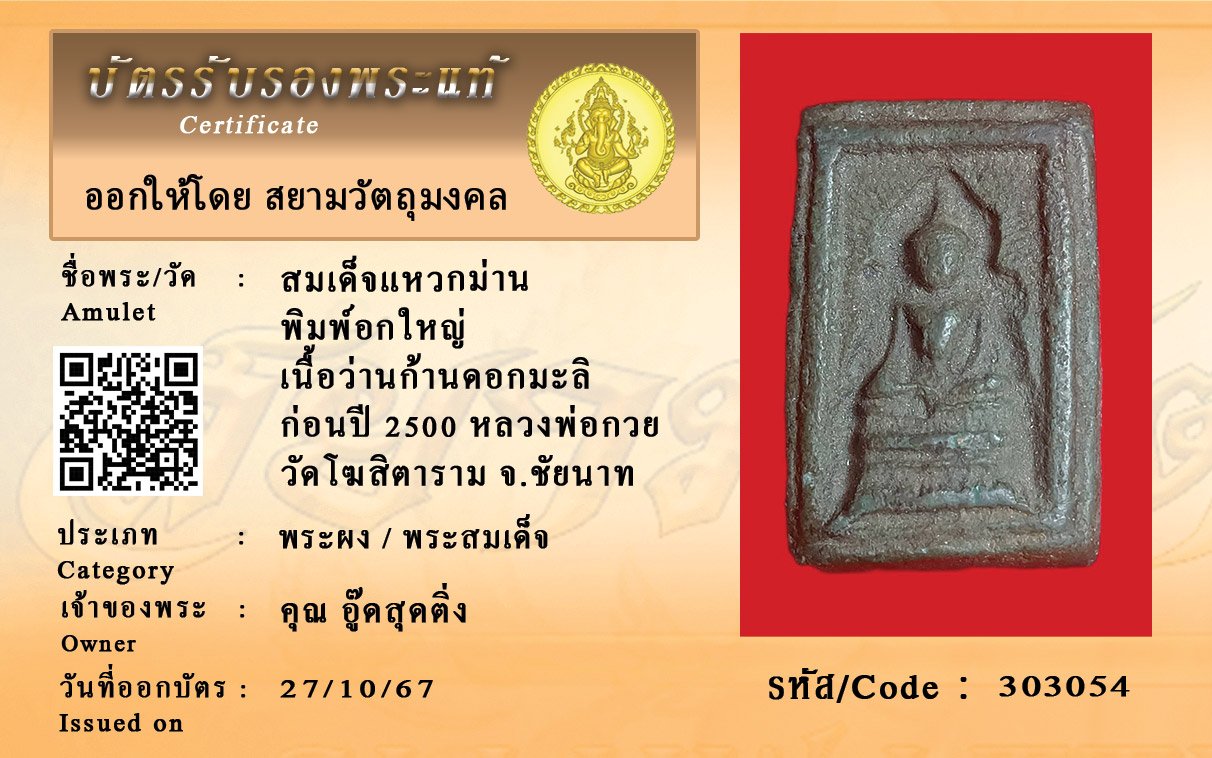 รหัสสินค้า : 303054 สมเด็จแหวกม่าน พิมพ์อกใหญ่ เนื้อว่านก้านดอกมะลิ ก่อนปี 2500 หลวงพ่อกวย วัดโฆสิตาราม จ.ชัยนาท