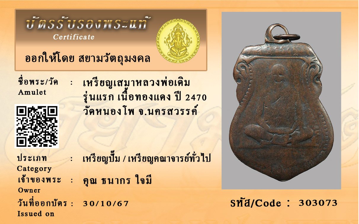 รหัสสินค้า : 303073 เหรียญเสมาหลวงพ่อเดิม รุ่นแรก เนื้อทองแดง ปี 2470 วัดหนองโพ จ.นครสวรรค์