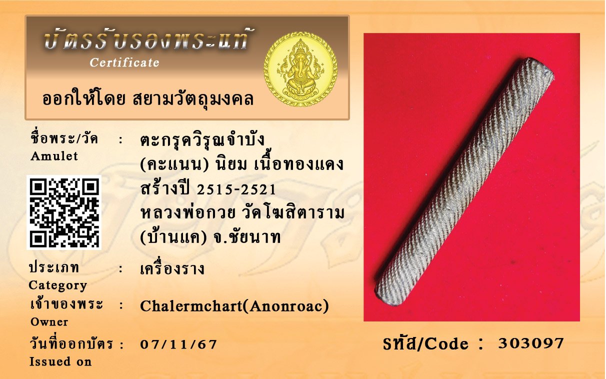รหัสสินค้า : 303097 ตะกรุดวิรุณจำบัง (คะแนน) นิยม เนื้อทองแดง สร้างปี 2515-2521 หลวงพ่อกวย วัดโฆสิตาราม (บ้านแค) จ.ชัยนาท