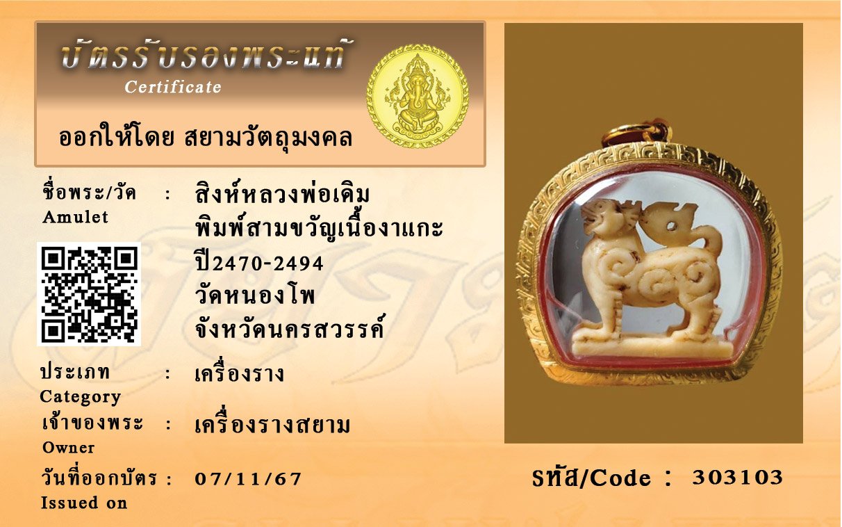 รหัสสินค้า : 303103 สิงห์หลวงพ่อเดิม พิมพ์สามขวัญเนื้องาแกะ ปี2470-2494 วัดหนองโพ จังหวัดนครสวรรค์
