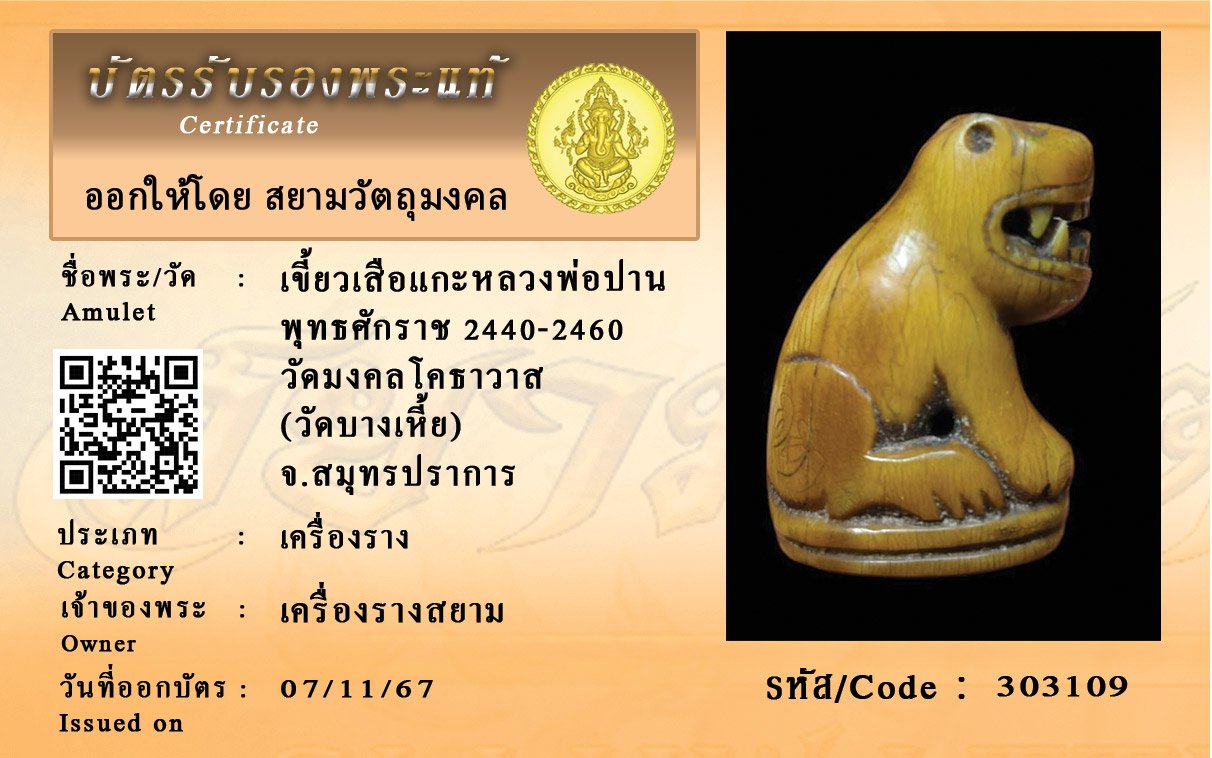 รหัสสินค้า : 303109 เขี้ยวเสือแกะหลวงพ่อปาน พุทธศักราช 2440-2460 วัดมงคลโคธาวาส(วัดบางเหี้ย) จ.สมุทรปราการ