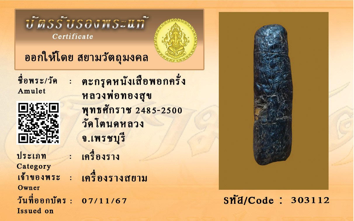 รหัสสินค้า : 303112 ตะกรุดหนังเสือพอกครั่ง หลวงพ่อทองสุข พุทธศักราช 2485-2500 วัดโตนดหลวง จ.เพรชบุรี