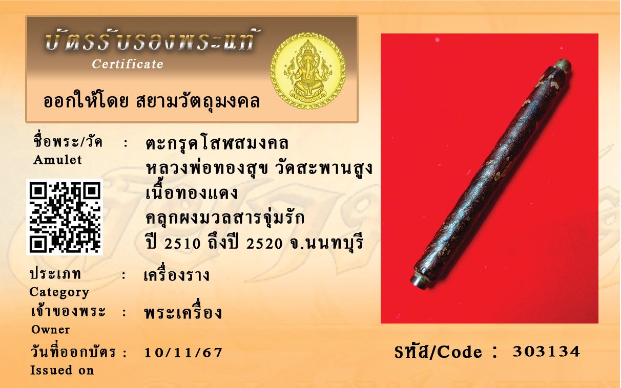 รหัสสินค้า : 303134 ตะกรุดโสฬสมงคล หลวงพ่อทองสุข วัดสะพานสูง เนื้อทองแดง คลุกผงมวลสารจุ่มรัก ปี 2510 ถึงปี 2520 จ.นนทบุรี