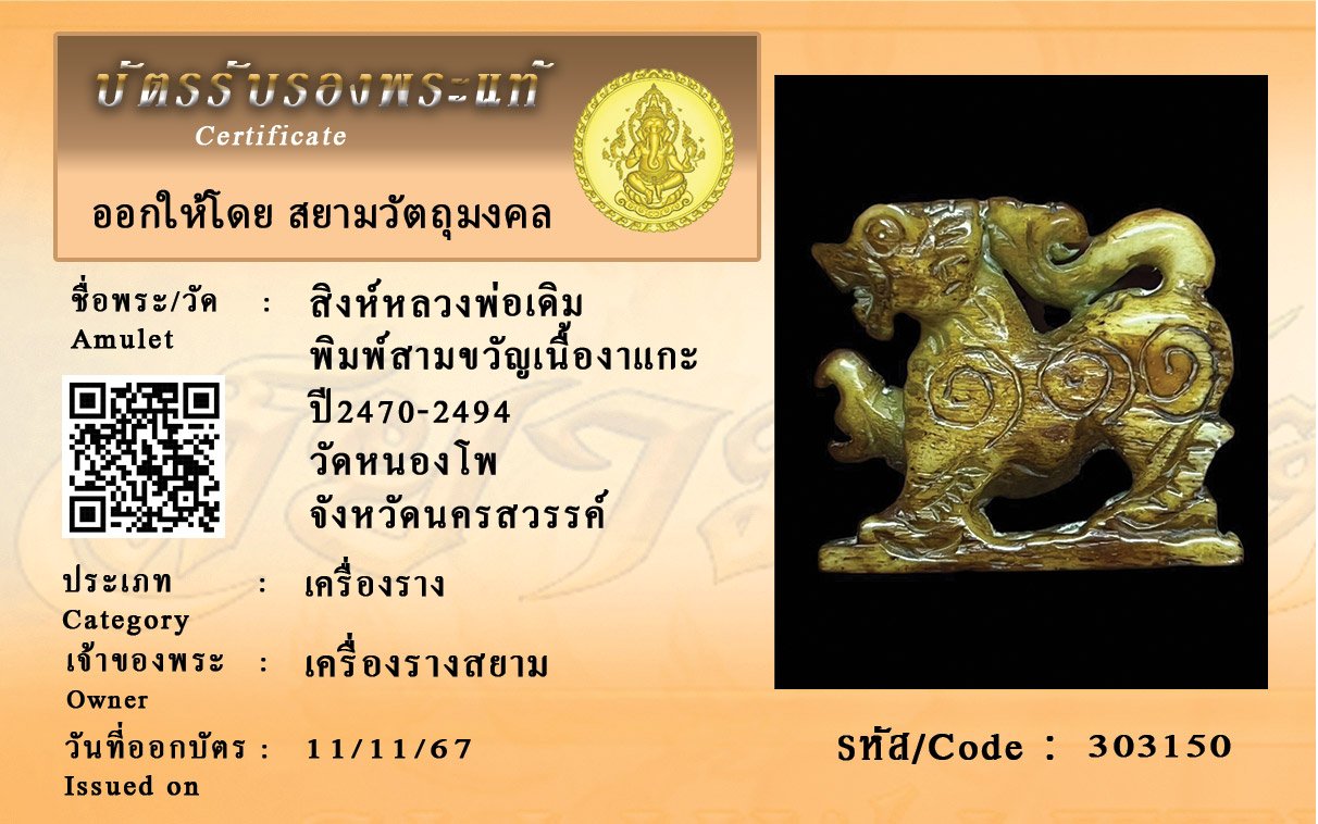 รหัสสินค้า : 303150 สิงห์หลวงพ่อเดิม พิมพ์สามขวัญเนื้องาแกะ ปี2470-2494 วัดหนองโพ จังหวัดนครสวรรค์
