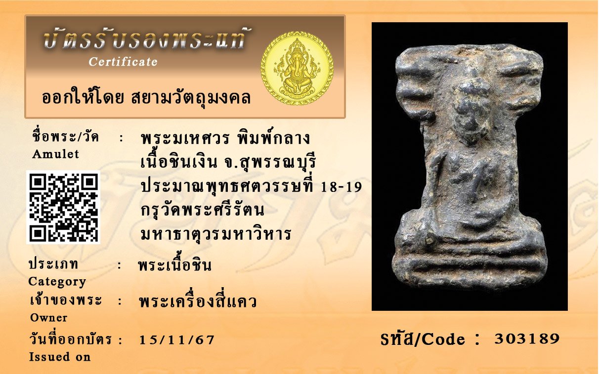 รหัสสินค้า : 303189 พระมเหศวร พิมพ์กลาง เนื้อชินเงิน ประมาณพุทธศตวรรษที่ 18-19 กรุวัดพระศรีรัตน มหาธาตุวรมหาวิหาร จ.สุพรรณบุรี