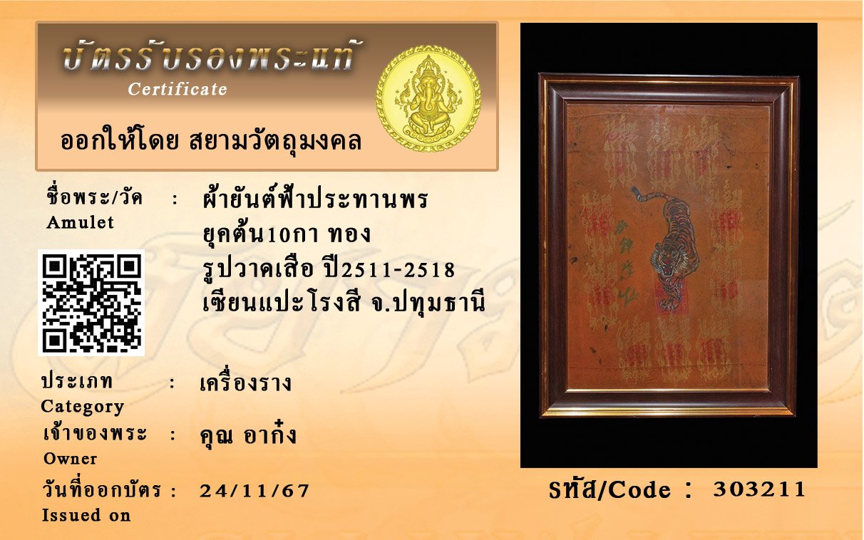 รหัสสินค้า : 303211 ผ้ายันต์ฟ้าประทานพร ยุคต้น10กา ทอง รูปวาดเสือ ปี2511-2518 เซียนแปะโรงสี จ.ปทุมธานี