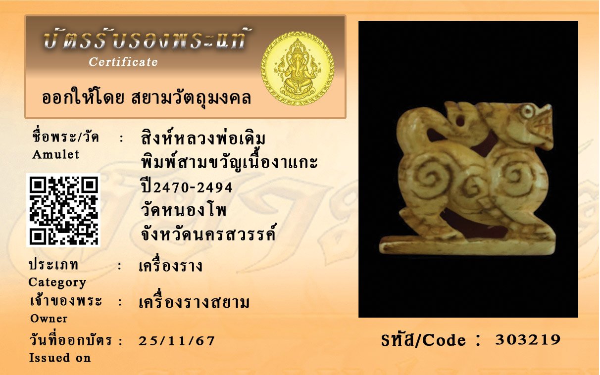รหัสสินค้า : 303219 สิงห์หลวงพ่อเดิม พิมพ์สามขวัญเนื้องาแกะ ปี2470-2494 วัดหนองโพ จังหวัดนครสวรรค์