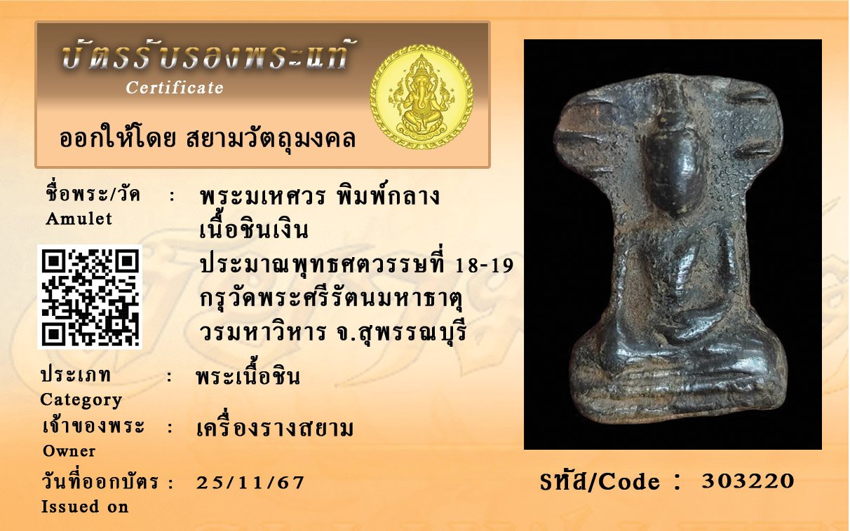 รหัสสินค้า : 303220 พระมเหศวร พิมพ์กลาง เนื้อชินเงิน ประมาณพุทธศตวรรษที่ 18-19 กรุวัดพระศรีรัตนมหาธาตุ วรมหาวิหาร จ.สุพรรณบุรี