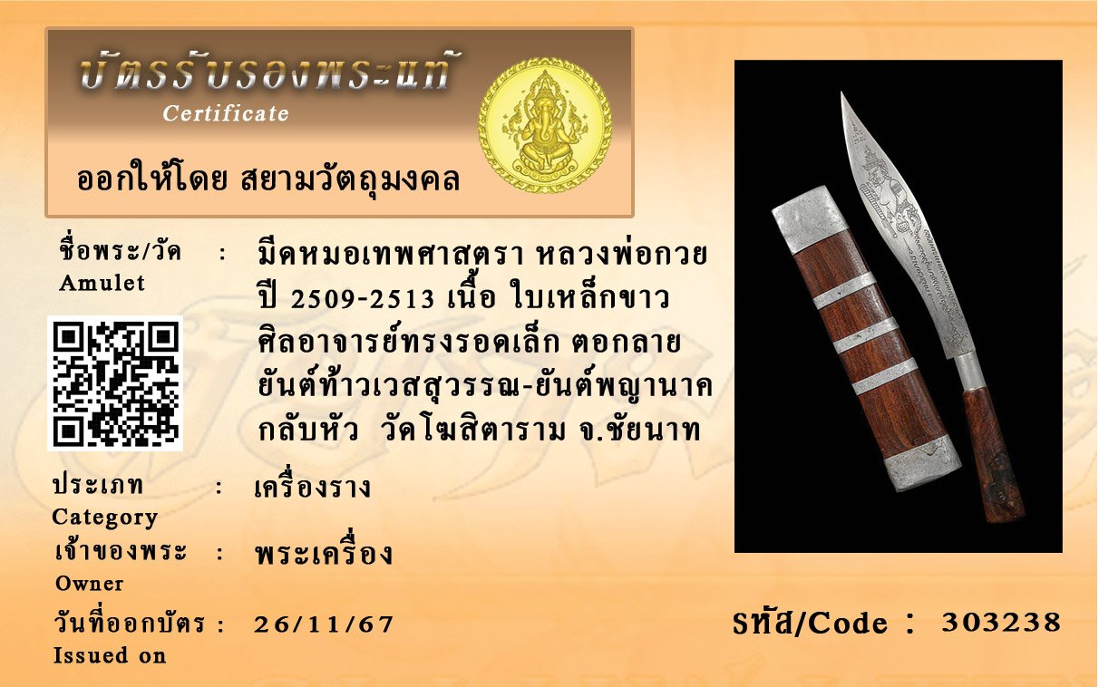 รหัสสินค้า : 303238 มีดหมอเทพศาสตรา หลวงพ่อกวย ปี 2509-2513 เนื้อ ใบเหล็กขาว ศิลอาจารย์ทรงรอดเล็ก ตอกลาย ยันต์ท้าวเวสสุวรรณ-ยันต์พญานาคกลับหัว (สร้างน้อย) วัดโฆสิตาราม จ.ชัยนาท (บ้านแค)
