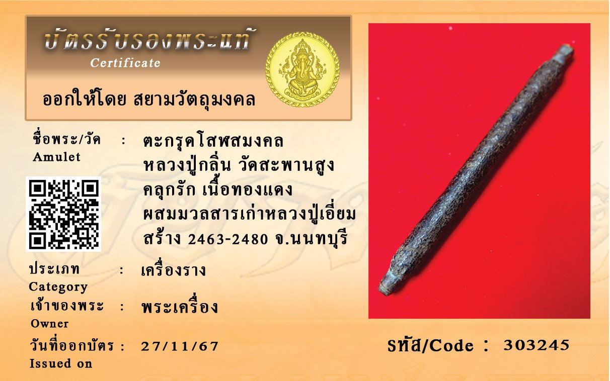 รหัสสินค้า : 303245 ตะกรุดโสฬสมงคล หลวงปู่กลิ่น วัดสะพานสูง คลุกรัก เนื้อทองแดง ผสมมวลสารเก่าหลวงปู่เอี่ยม สร้าง 2463-2480 จ.นนทบุรี