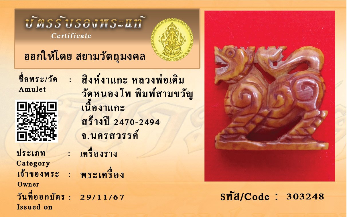 รหัสสินค้า : 303248 สิงห์งาแกะ หลวงพ่อเดิม วัดหนองโพ พิมพ์สามขวัญ เนื้องาแกะ สร้างปี 2470-2494 จ.นครสวรรค์