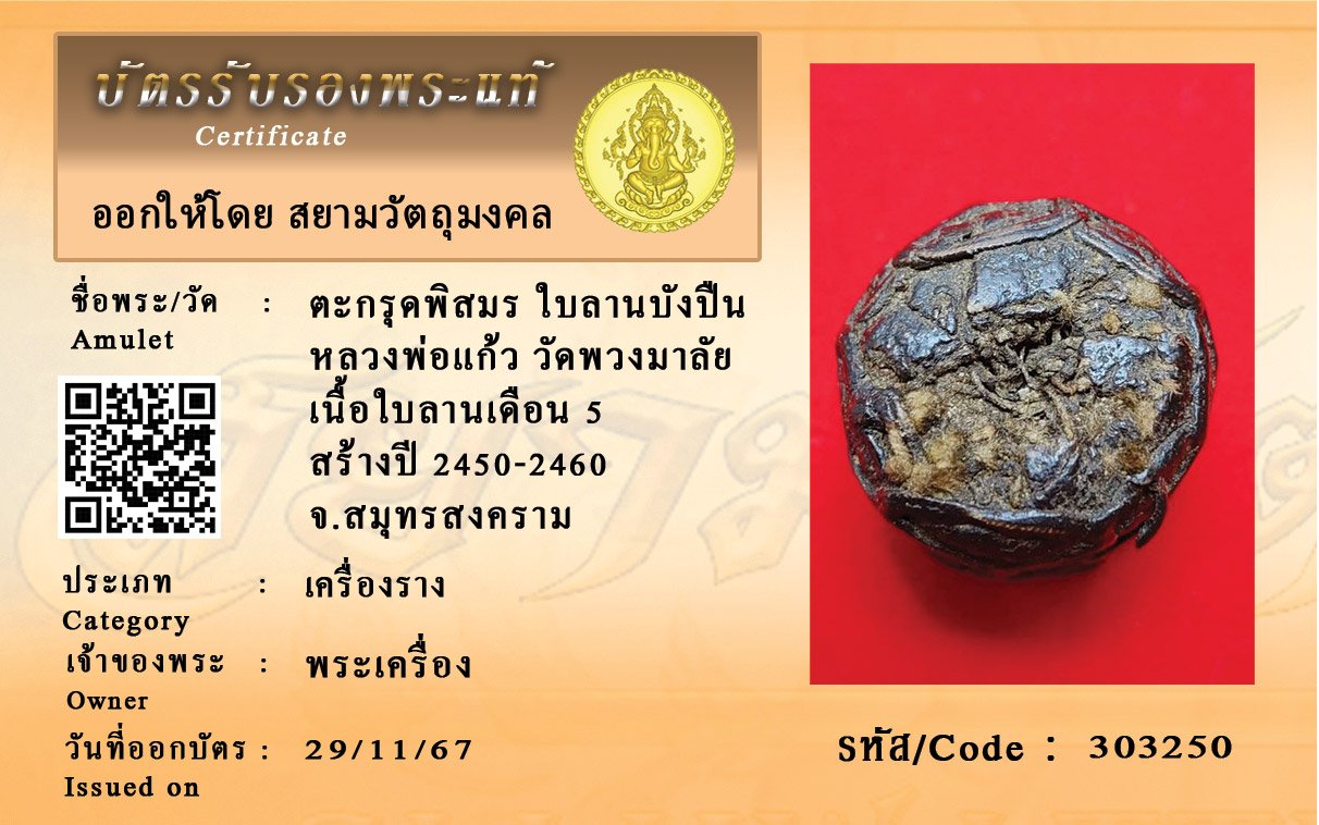 รหัสสินค้า : 303250 ตะกรุดพิสมร ใบลานบังปืน หลวงพ่อแก้ว วัดพวงมาลัย เนื้อใบลานเดือน 5 สร้างปี 2450-2460 จ.สมุทรสงคราม