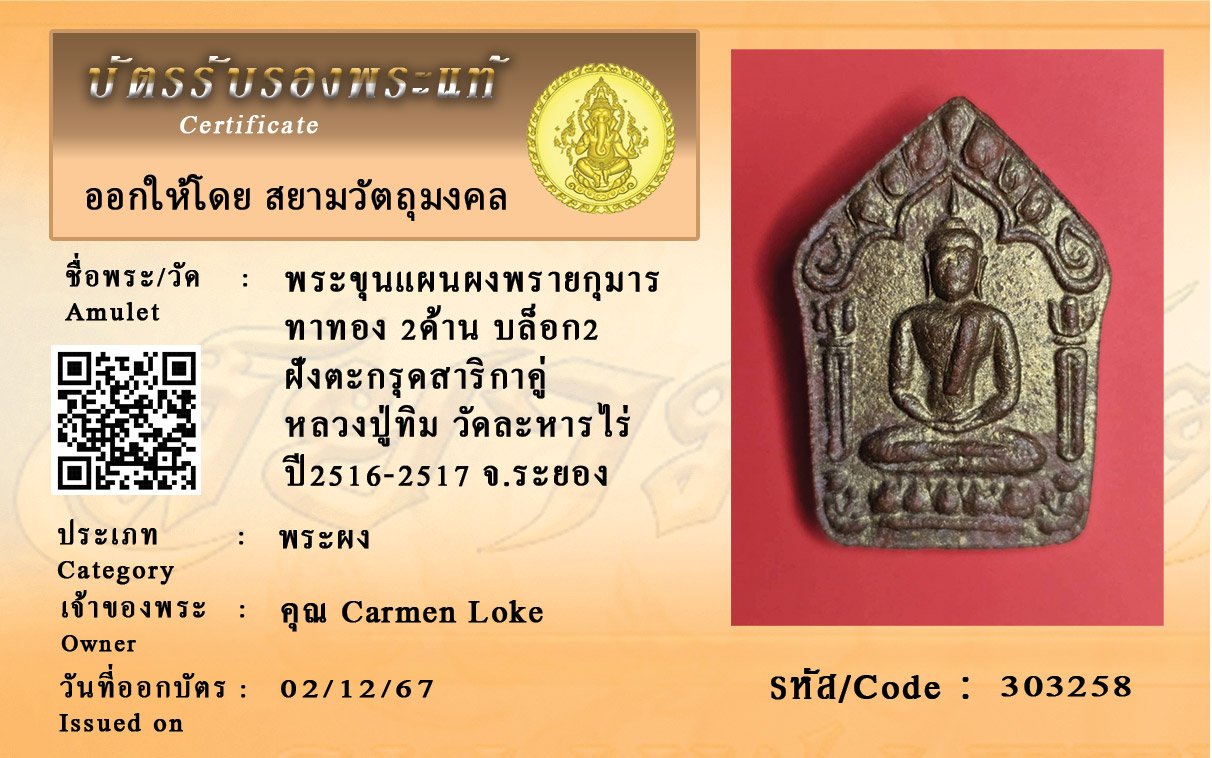 รหัสสินค้า : 303258 พระขุนแผนผงพรายกุมาร ทาทอง 2ด้าน บล็อก2 ฝังตะกรุดสาริกาคู่ หลวงปู่ทิม วัดละหารไร่ ปี2516-2517 จ.ระยอง