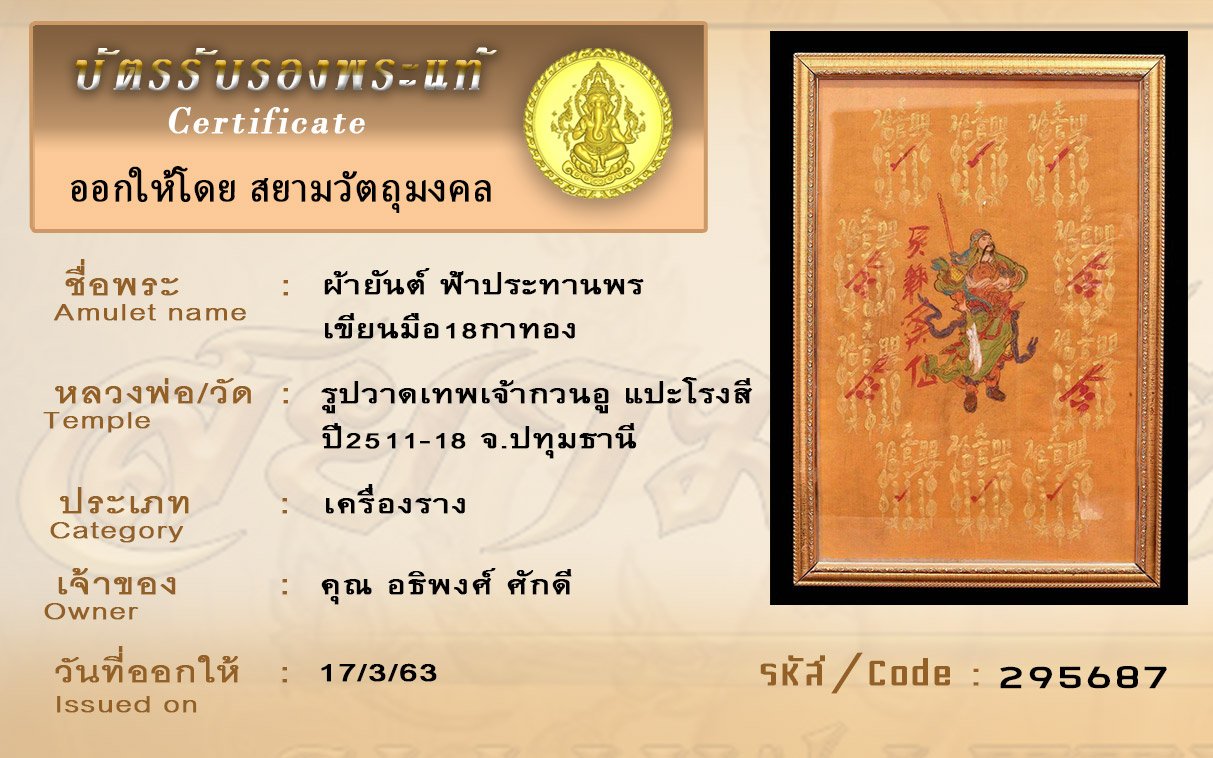 รหัสสินค้า : (295687) ผ้ายันต์ฟ้าประทานพร เขียนมือ 18กาทอง รูปวาดเทพเจ้ากวนอู แปะโรงสี ปี2511-18 จ.ปทุมธาน