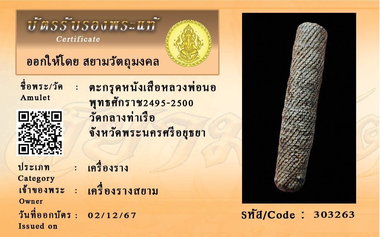 รหัสสินค้า : 303263 ตะกรุดหนังเสือหลวงพ่อนอ พุทธศักราช2495-2500 วัดกลางท่าเรือ จังหวัดพระนครศรีอยุธยา