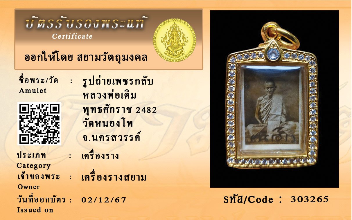 รหัสสินค้า : 303265 รูปถ่ายเพชรกลับ หลวงพ่อเดิม พุทธศักราช 2482 วัดหนองโพ จ.นครสวรรค์