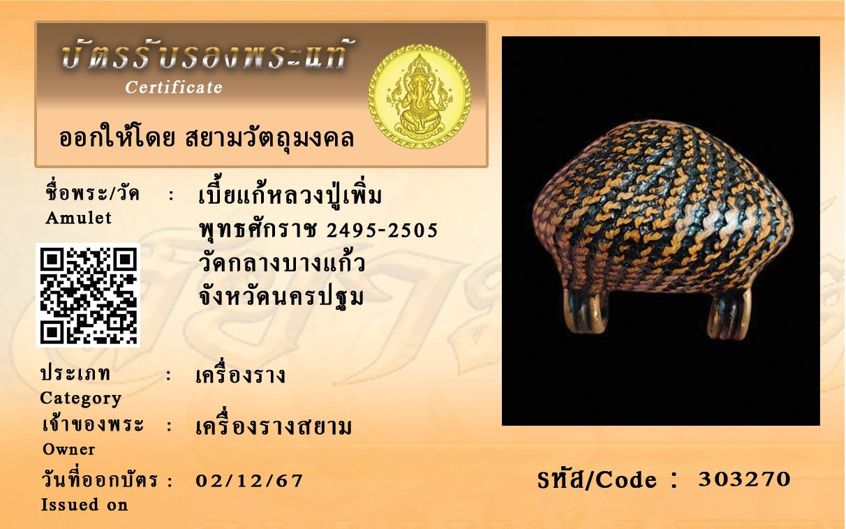 รหัสสินค้า : 303270 เบี้ยแก้หลวงปู่เพิ่ม พุทธศักราช 2495-2505 วัดกลางบางแก้ว จังหวัดนครปฐม