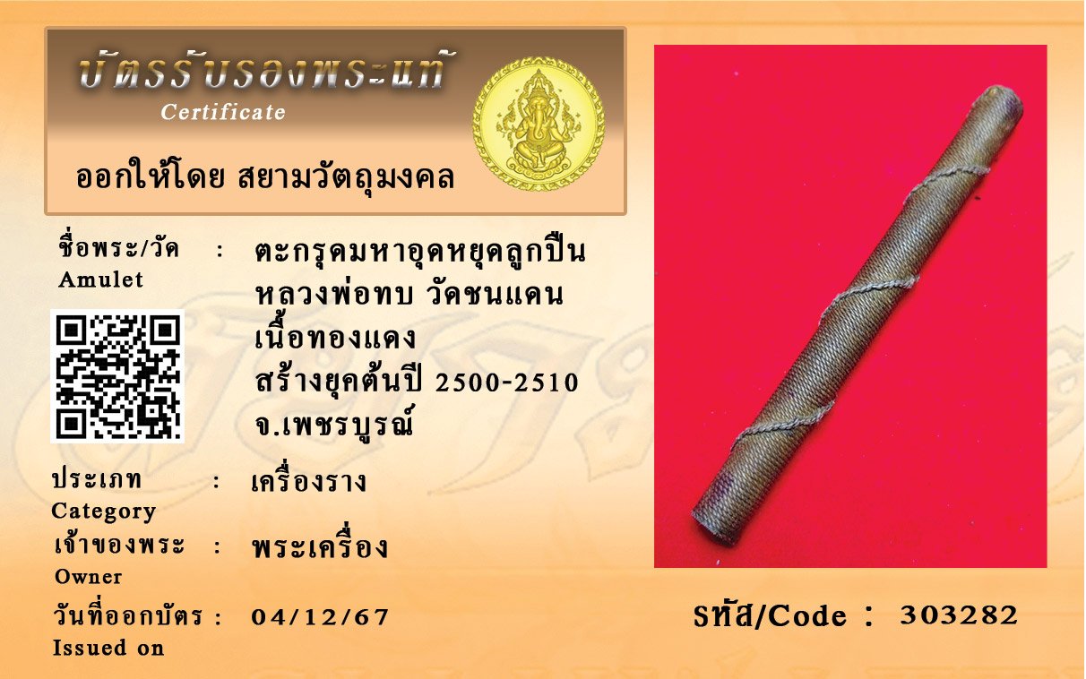 รหัสสินค้า : 303282 ตะกรุดมหาอุดหยุดลูกปืน หลวงพ่อทบ วัดชนแดน เนื้อทองแดง สร้างยุคต้นปี 2500-2510 จ.เพชรบูรณ์