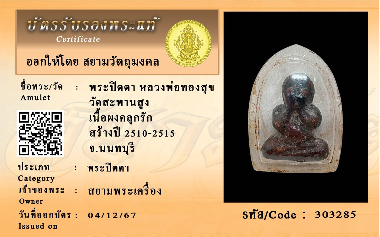 รหัสสินค้า : 303285 พระปิดตา หลวงพ่อทองสุข วัดสะพานสูง เนื้อผงคลุกรัก สร้างปี 2510-2515 จ.นนทบุรี