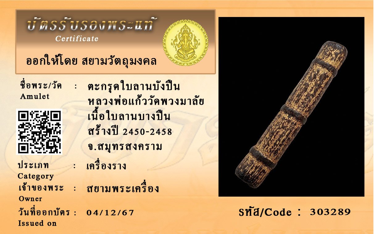 รหัสสินค้า : 303289 ตะกรุดใบลานบังปืน หลวงพ่อแก้ววัดพวงมาลัย เนื้อใบลานบางปืน สร้างปี 2450-2458 จ.สมุทรสงคราม