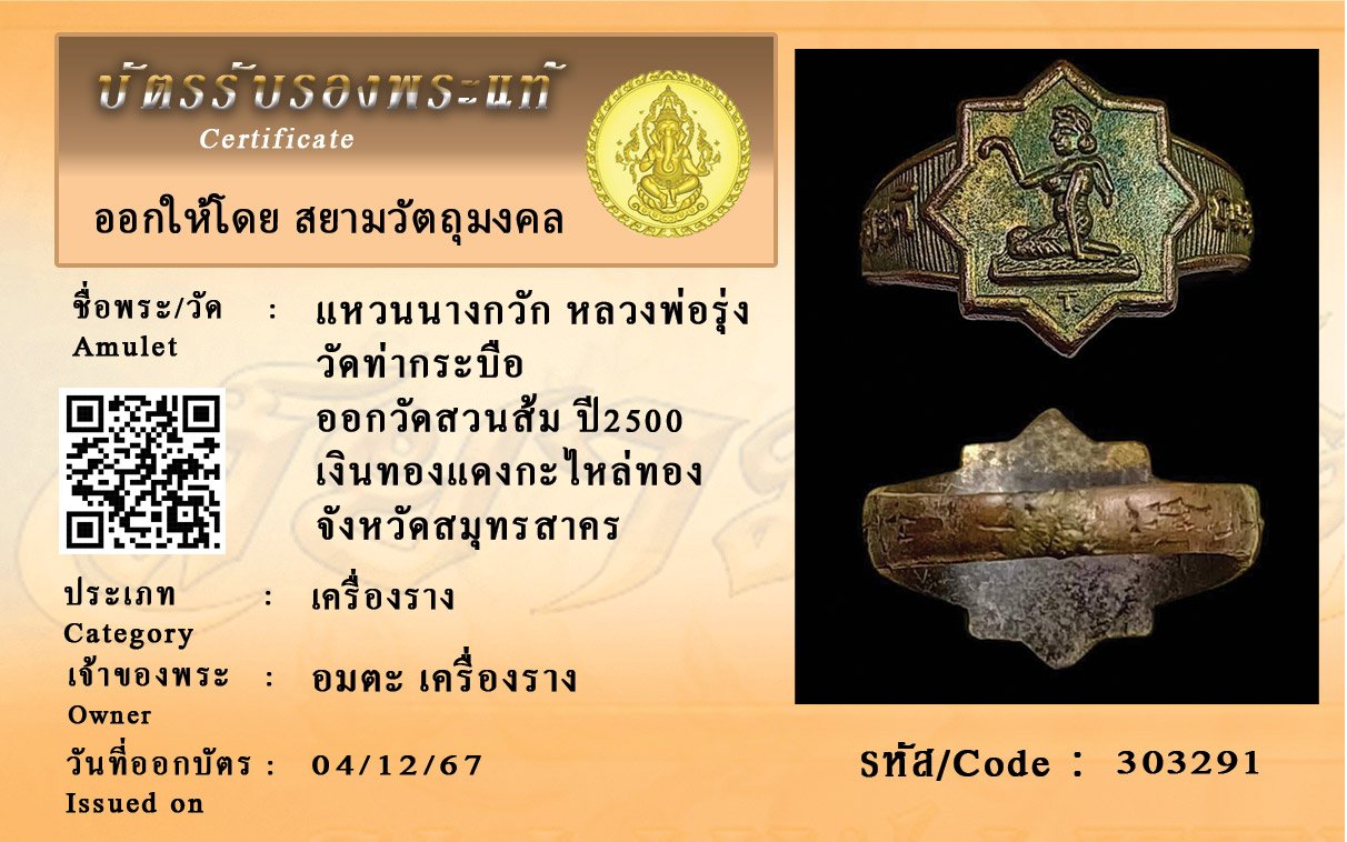 รหัสสินค้า : 303291 แหวนนางกวัก หลวงพ่อรุ่ง วัดท่ากระบือ ออกวัดสวนส้ม ปี2500 เงินทองแดงกะไหล่ทอง จังหวัดสมุทรสาคร