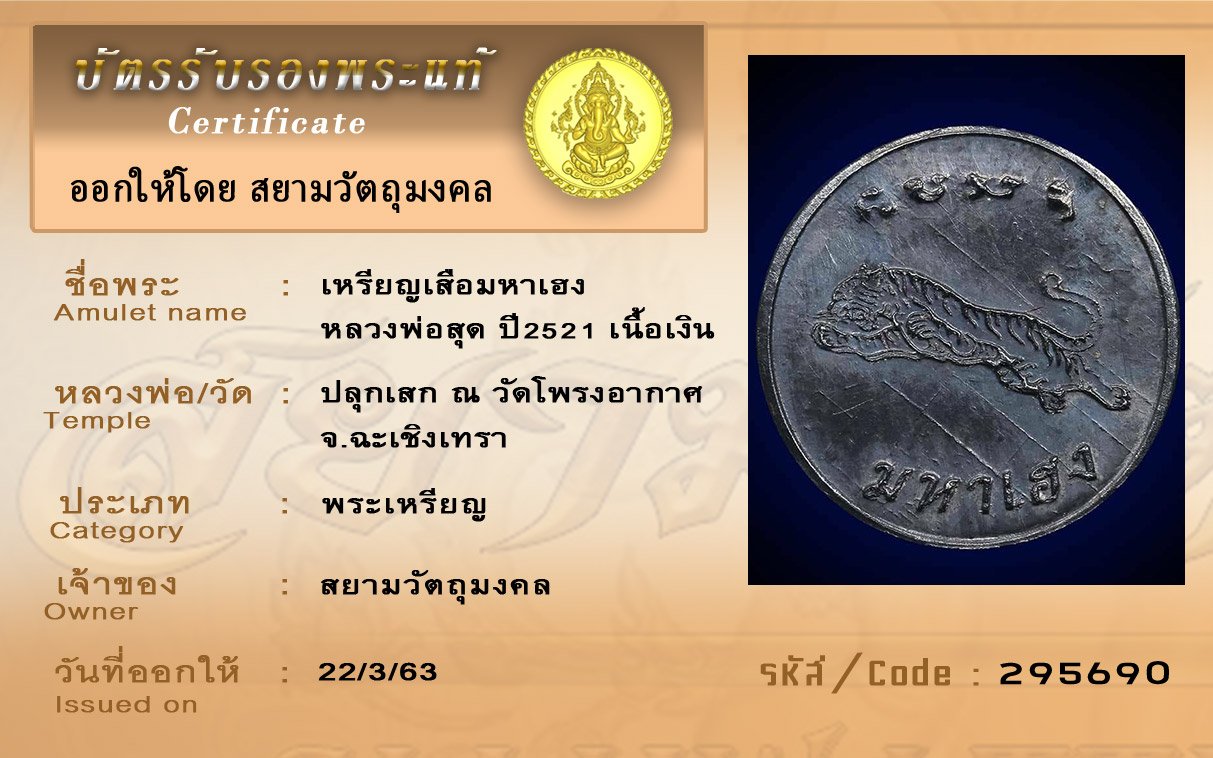 รหัสสินค้า : (295690) เหรียญเสือมหาเฮง หลวงพ่อสุด ปลุกเสก ณ วัดโพรงอากาศ ปี2521 เนื้อเงิน จังหวัดฉะเชิงเทรา