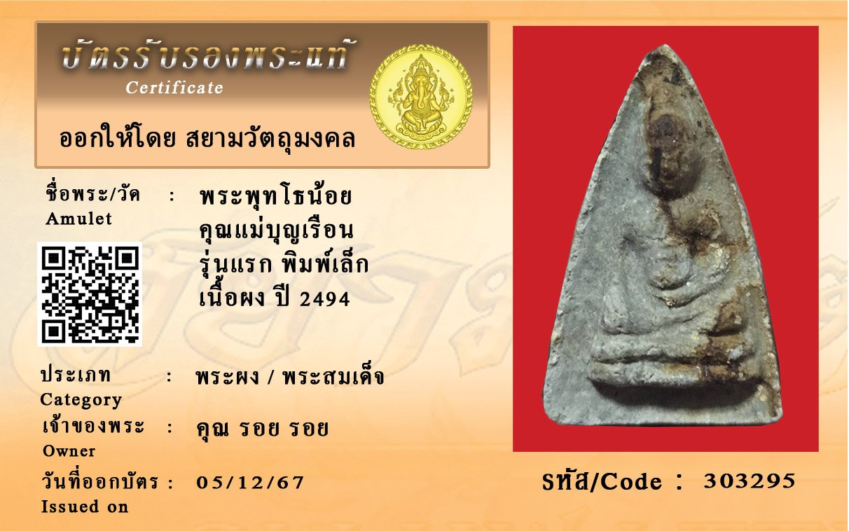 รหัสสินค้า : 303295 พระพุทโธน้อย คุณแม่บุญเรือน รุ่นแรก พิมพ์เล็ก เนื้อผง ปี 2494