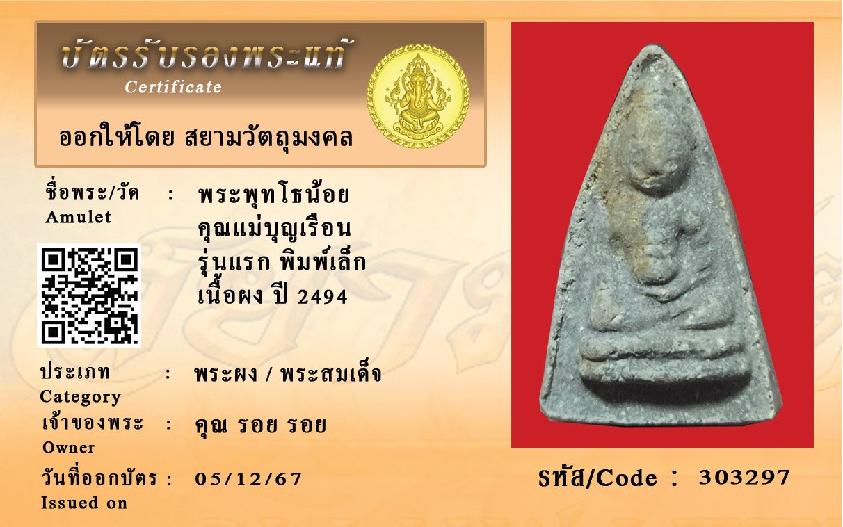 รหัสสินค้า : 303297 พระพุทโธน้อย คุณแม่บุญเรือน รุ่นแรก พิมพ์เล็ก เนื้อผง ปี 2494