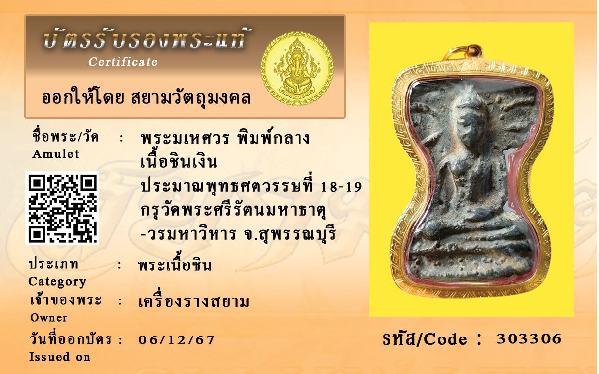 รหัสสินค้า : 303306 พระมเหศวร พิมพ์กลาง เนื้อชินเงิน ประมาณพุทธศตวรรษที่ 18-19 กรุวัดพระศรีรัตนมหาธาตุ -วรมหาวิหาร จ.สุพรรณบุรี
