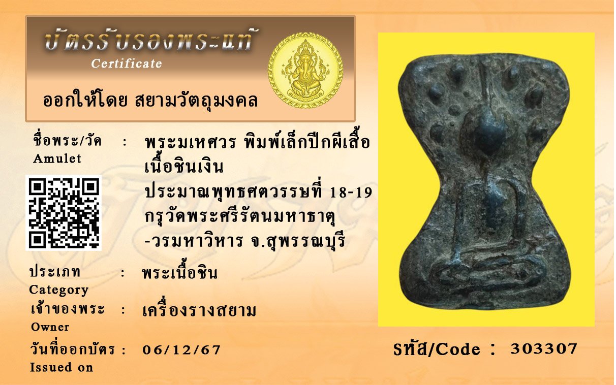 รหัสสินค้า : 303307 พระมเหศวร พิมพ์เล็กปีกผีเสื้อ เนื้อชินเงิน ประมาณพุทธศตวรรษที่ 18-19 กรุวัดพระศรีรัตนมหาธาตุ -วรมหาวิหาร จ.สุพรรณบุรี