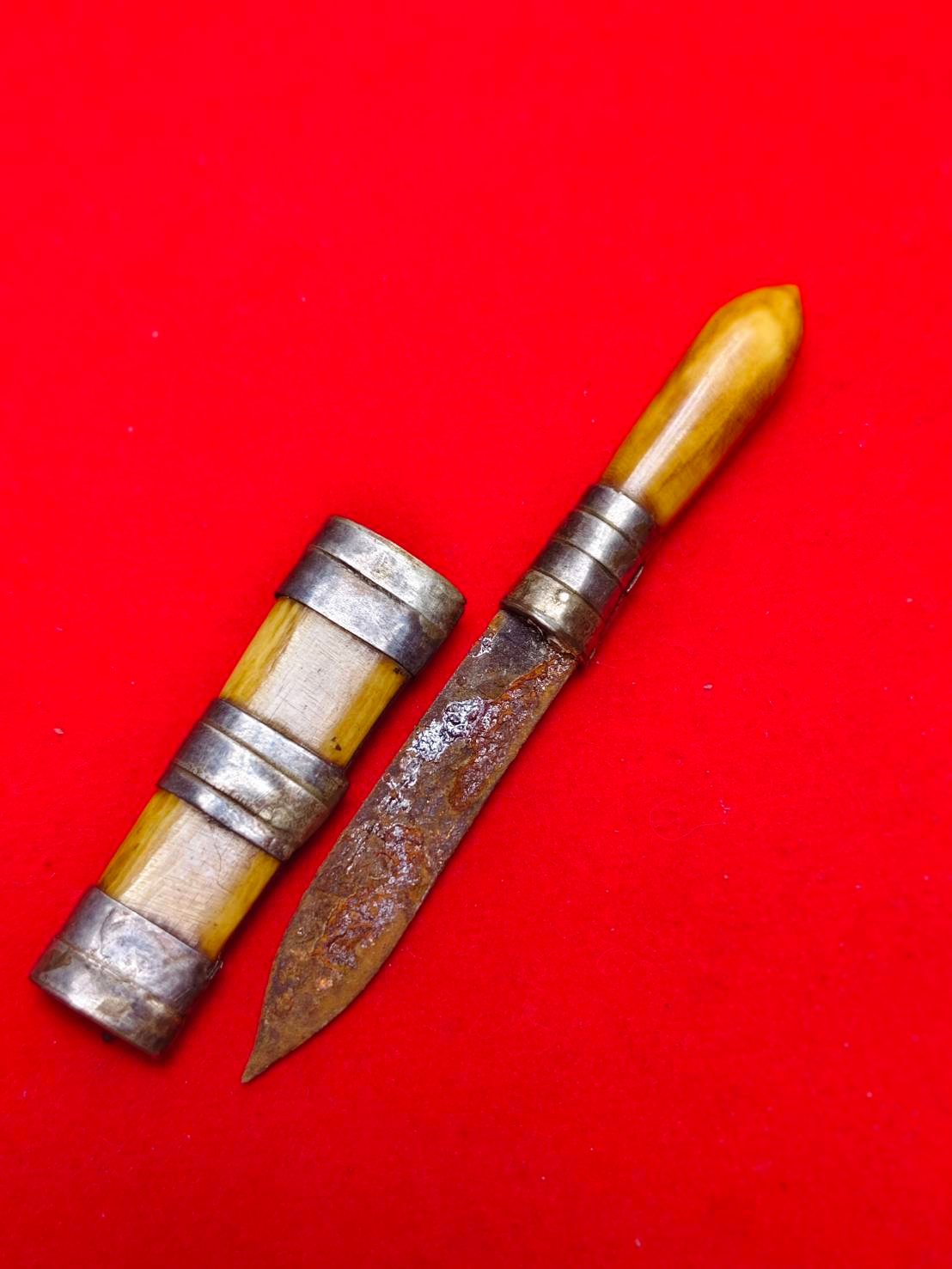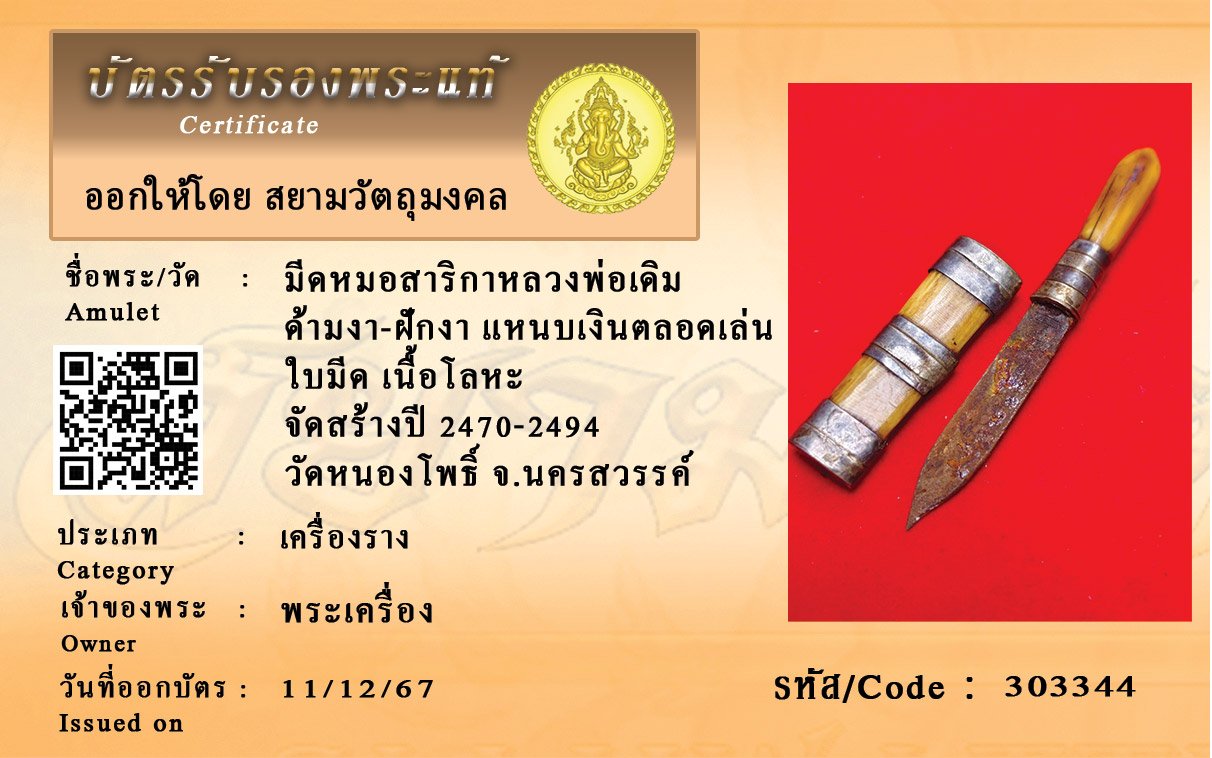 รหัสสินค้า : 303344 มีดหมอสาริกาหลวงพ่อเดิม ด้ามงา-ฝักงา แหนบเงินตลอดเล่น ใบมีด เนื้อโลหะ จัดสร้างปี 2470-2494 วัดหนองโพธิ์ จ.นครสวรรค์