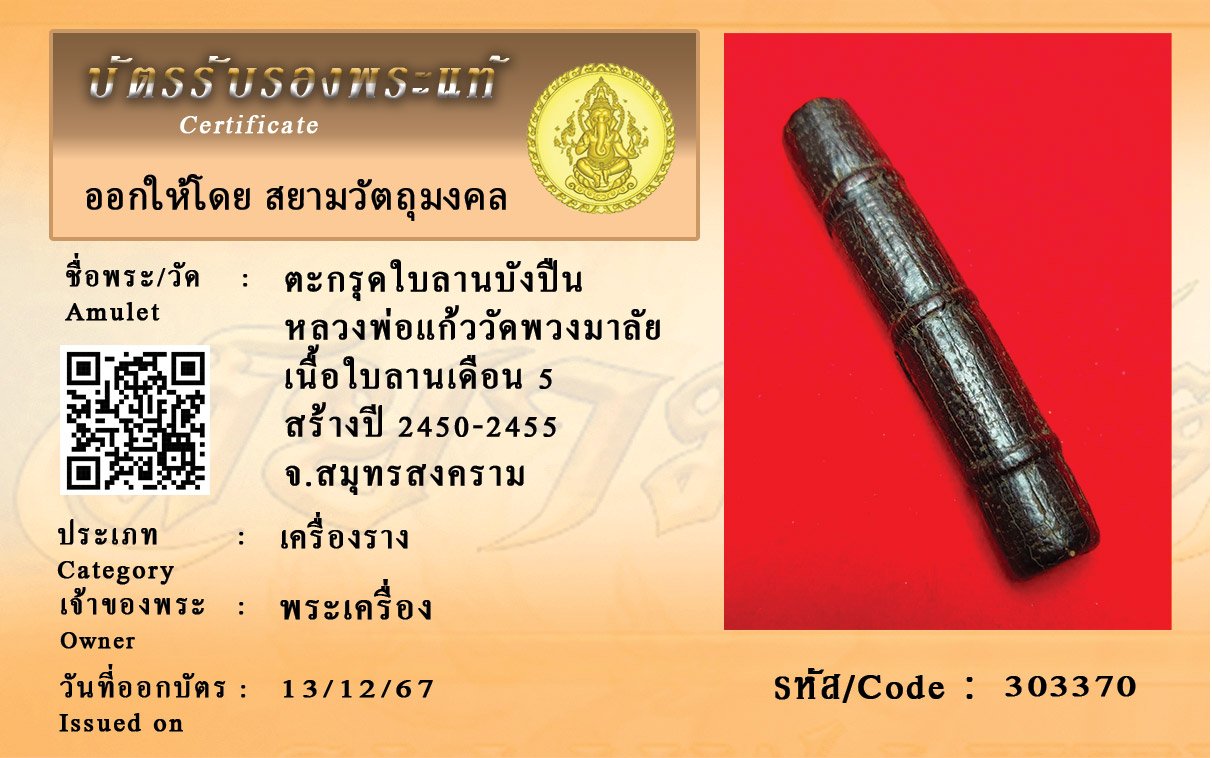 รหัสสินค้า : 303370 ตะกรุดใบลานบังปืน หลวงพ่อแก้ววัดพวงมาลัย เนื้อใบลานเดือน 5 สร้างปี 2450-2455 จ.สมุทรสงคราม
