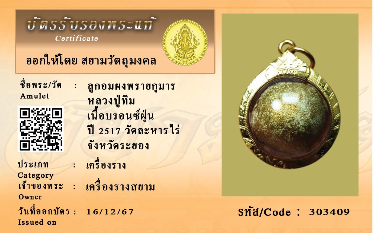 รหัสสินค้า : 303409 ลูกอมผงพรายกุมาร หลวงปู่ทิม เนื้อบรอนซ์ฝุ่น ปี 2517 วัดละหารไร่ จังหวัดระยอง