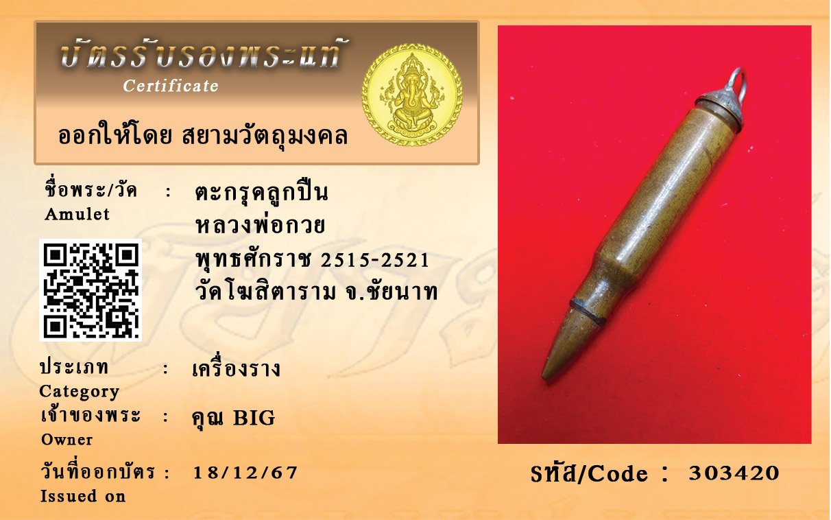 รหัสสินค้า : 303420 ตะกรุดลูกปืน หลวงพ่อกวย พุทธศักราช 2515-2521 วัดโฆสิตาราม จ.ชัยนาท