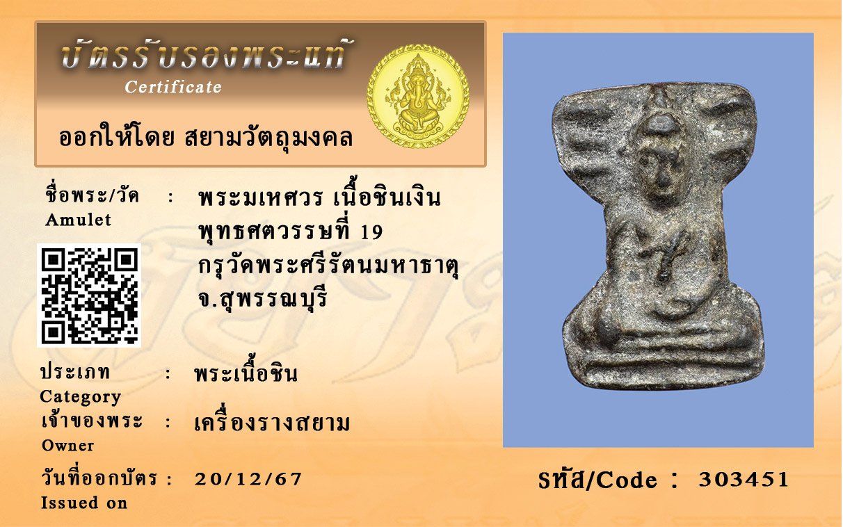 รหัสสินค้า : 303451 พระมเหศวร เนื้อชินเงิน พุทธศตวรรษที่ 19 กรุวัดพระศรีรัตนมหาธาตุ จ.สุพรรณบุรี