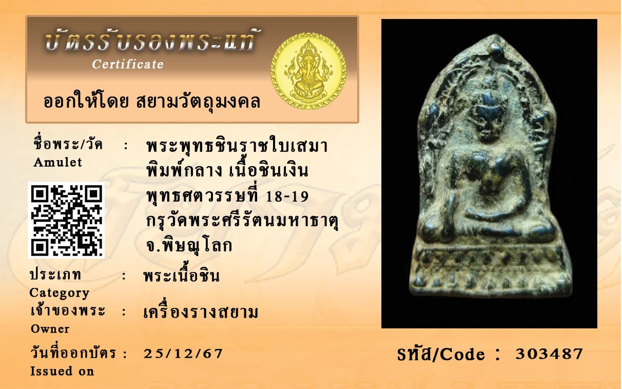 รหัสสินค้า : 303487 พระพุทธชินราชใบเสมา พิมพ์กลาง เนื้อชินเงิน พุทธศตวรรษที่ 18-19 กรุวัดพระศรีรัตนมหาธาตุ จ.พิษณุโลก