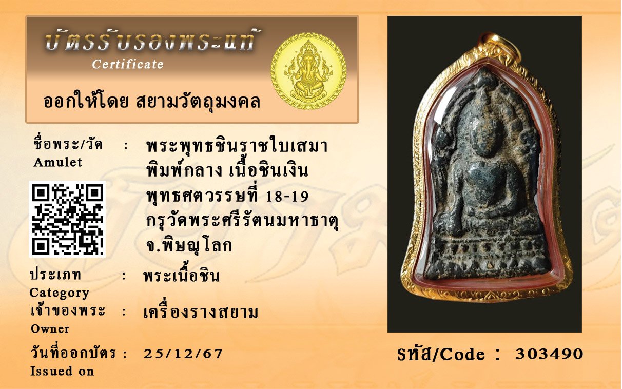 รหัสสินค้า : 303490 พระพุทธชินราชใบเสมา พิมพ์กลาง เนื้อชินเงิน พุทธศตวรรษที่ 18-19 กรุวัดพระศรีรัตนมหาธาตุ จ.พิษณุโลก