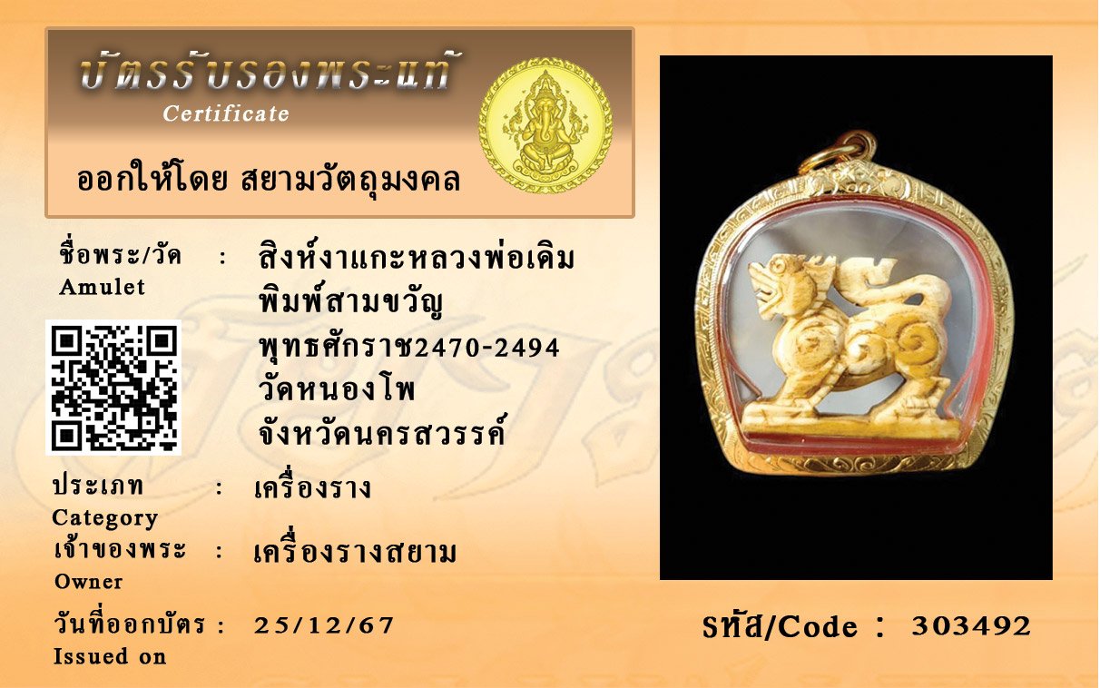 รหัสสินค้า : 303492 สิงห์งาแกะหลวงพ่อเดิม พิมพ์สามขวัญ พุทธศักราช2470-2494 วัดหนองโพ จังหวัดนครสวรรค์