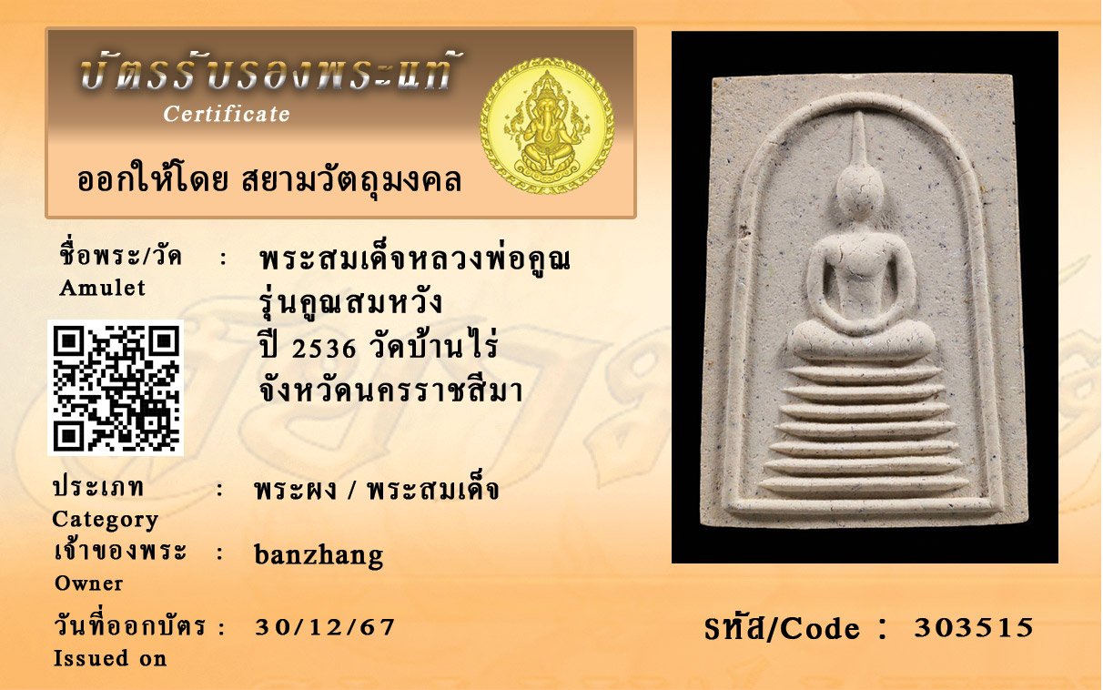 รหัสสินค้า : 303515 พระสมเด็จหลวงพ่อคูณ รุ่นคูณสมหวัง ปี 2536 วัดบ้านไร่ จังหวัดนครราชสีมา