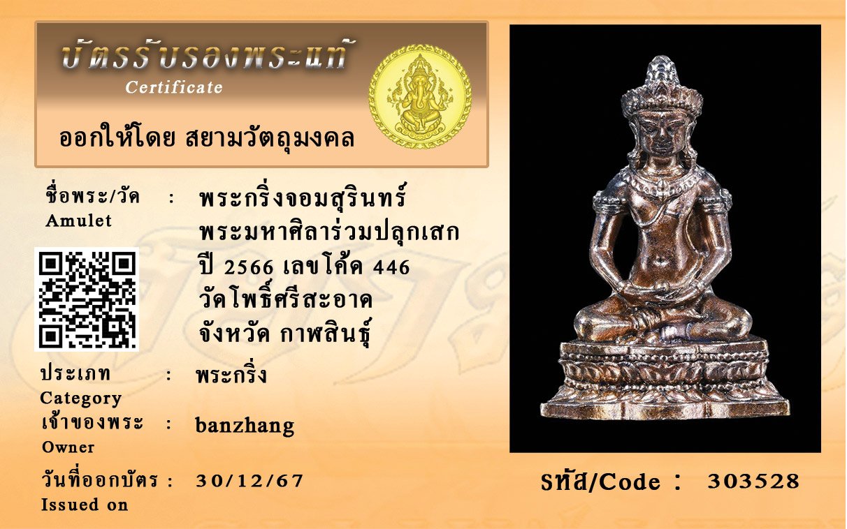 รหัสสินค้า : 303528 พระกริ่งจอมสุรินทร์ พระมหาศิลาร่วมปลุกเสก ปี 2566 เลขโค้ด 446 วัดโพธิ์ศรีสะอาด จังหวัด กาฬสินธุ์
