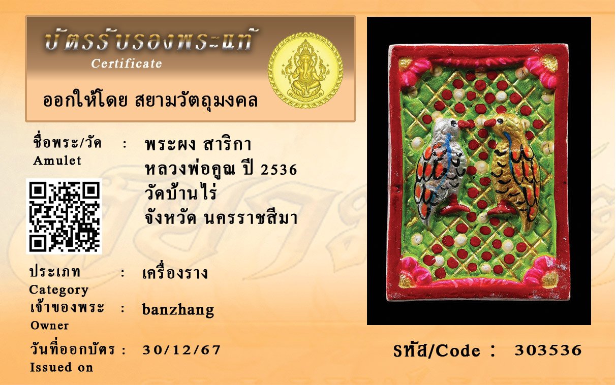 รหัสสินค้า : 303536 พระผง สาริกา หลวงพ่อคูณ ปี 2536 วัดบ้านไร่ จังหวัด นครราชสีมา